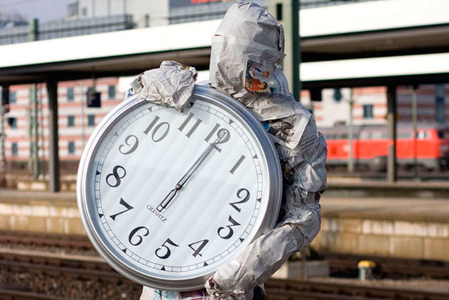Spiegel der Gegenwart Aufnahmeprüfung FH Designstudium. Ich entschied mich dazu einen Menschen in Zeitungspapier einzuwickeln und ihn in einer Umgebung zu Fotografieren die ständig im Wandel ist. Dabei sollte das Zeitungspapier die angehaltene Zeit/Ereignisse darstellen und die Uhr, die uns ständig zeigt, wie die Zeit verstreicht und meinen Spiegel verdeutlicht.