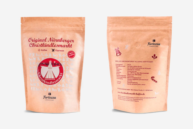 Fortezza Christkindleskaffee Die Fortezza Espressomanufaktur brachte zu Weihnachten einen Nürnberger Christkindlesmarktkaffee heraus, der unter anderem auf dem Christkindlesmarkt verkauft wird. Ich hatte das Vergnügen die Tüte dafür eigens zu entwerfen. Das Besondere ist die Naturtüte und der Direktdruck, was der Kaffeetüte einen warmen und hochwertigen Charme verleiht. Die passenden Flyer kündigen den exklusiv zur Weihnachtszeit…