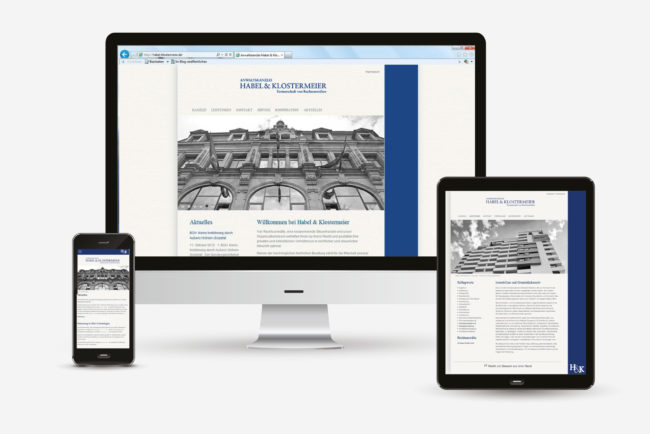 Homepageneugestaltung der Rechtsanwaltskanzlei Habel&Klostermeier Das blaue Band sollte weiterhin beibehalten werden, ebenso das Logo. Das Ziel war es eine übersichtliche Webseite zu schaffen, die mit großen Bildern überzeugt, die Persönlichkeit der Kanzlei widerspiegelt und Kompetenz vermittelt. Hier geht´s zur Seite