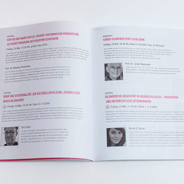 Im Rahmen meines Studiums sollte ein Kongressplaner für das Event in der Nürnberger Innenstadt „Bildnerisches Gestalten und kreatives Schreiben in der Entwicklung des Menschen“ entstehen. Der Beste sollte für das Event verwendet werden. Meiner kam auf den zweiten Platz.